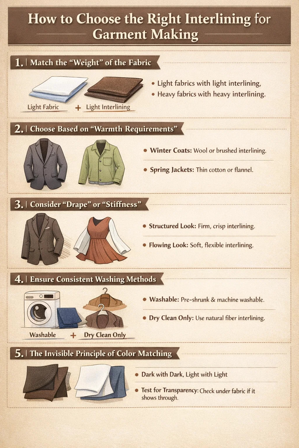 ในการทำเสื้อผ้าการเลือกให้เหมาะสม ซับใน เป็นขั้นตอนสำคัญในการกำหนดเนื้อสัมผัสและอายุการใช้งานของเสื้อผ้าสำเร็จรูป เมื่อเลือกผ้ากาว คุณสามารถอ้างอิงถึงหลักการง่ายๆ และใช้งานได้จริงดังต่อไปนี้: