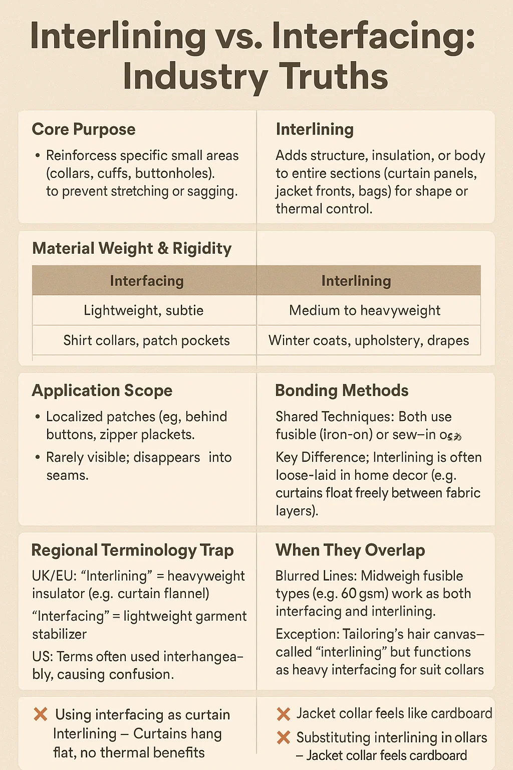 ความแตกต่างที่สำคัญ: Interlining มักจะหลวมในการตกแต่งบ้าน (เช่นผ้าม่านลอยได้อย่างอิสระระหว่างชั้นผ้า)