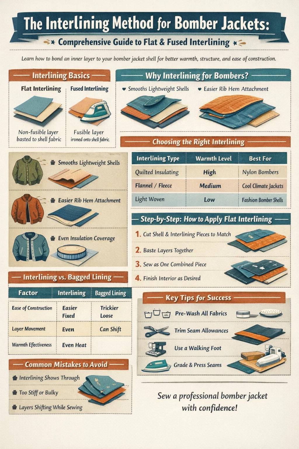 ใช่ คุณสามารถใช้วิธีซับในเพื่อเรียงเสื้อแจ็คเก็ตบอมเบอร์ได้ และสำหรับท่อระบายน้ำทิ้งหลายๆ แห่ง จริงๆ แล้วนี่เป็นทางเลือกที่ชาญฉลาดกว่าซับในแบบหลวมๆ แบบดั้งเดิม วิธีการอินเทอร์ไลน์จะเชื่อมหรือติดชั้นผ้ารองเข้ากับชิ้นส่วนเปลือกนอกของคุณโดยตรง ก่อน การประกอบเสื้อผ้าช่วยให้คุณควบคุมโครงสร้าง ความอบอุ่น และการตกแต่งได้มากขึ้น ไม่ว่าคุณจะใช้โครงไนลอนน้ำหนักเบาหรือผ้าวูลหนา ซับในก็ปรับให้เข้ากับโครงสร้างของเครื่องบินทิ้งระเบิดได้ดี อย่างไรก็ตาม นี่ไม่ใช่แนวทางเริ่มต้นเสมอไป และการรู้ว่าเมื่อใดจะได้ผลดีที่สุด และควรเลือกผ้าบุด้านในแบบใด สร้างความแตกต่างระหว่างเสื้อแจ็คเก็ตที่ดูเป็นมืออาชีพกับเสื้อแจ็คเก็ตที่ย่น อัดแน่น หรือรู้สึกแข็งทื่อ