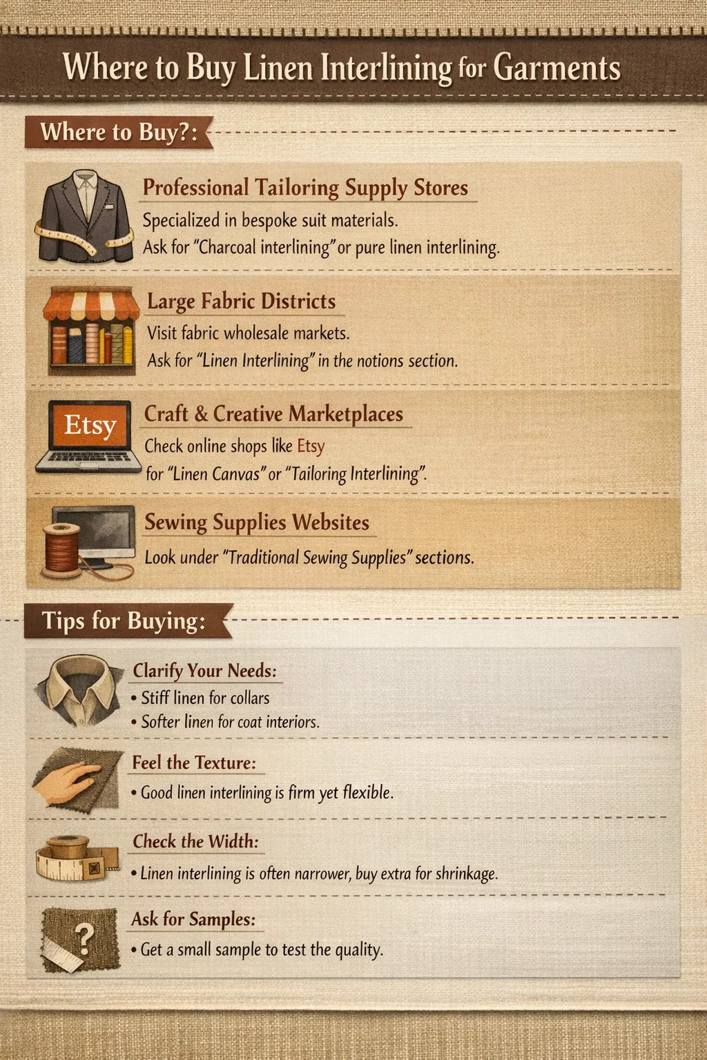 บางเว็บไซต์สำหรับผู้ที่ชื่นชอบการตัดเย็บโดยเฉพาะมีหมวดหมู่ที่มีรายละเอียดมาก มองหาส่วนที่จำหน่าย "อุปกรณ์เย็บผ้าแบบดั้งเดิม" เนื่องจากแฟชั่นฟาสต์แฟชั่นสมัยใหม่มักใช้ผ้าบุด้านในแบบพลาสติกละลายได้ ในขณะที่เสื้อผ้าทำมือคุณภาพสูงจะใช้ผ้าบุด้วยผ้าลินิน
