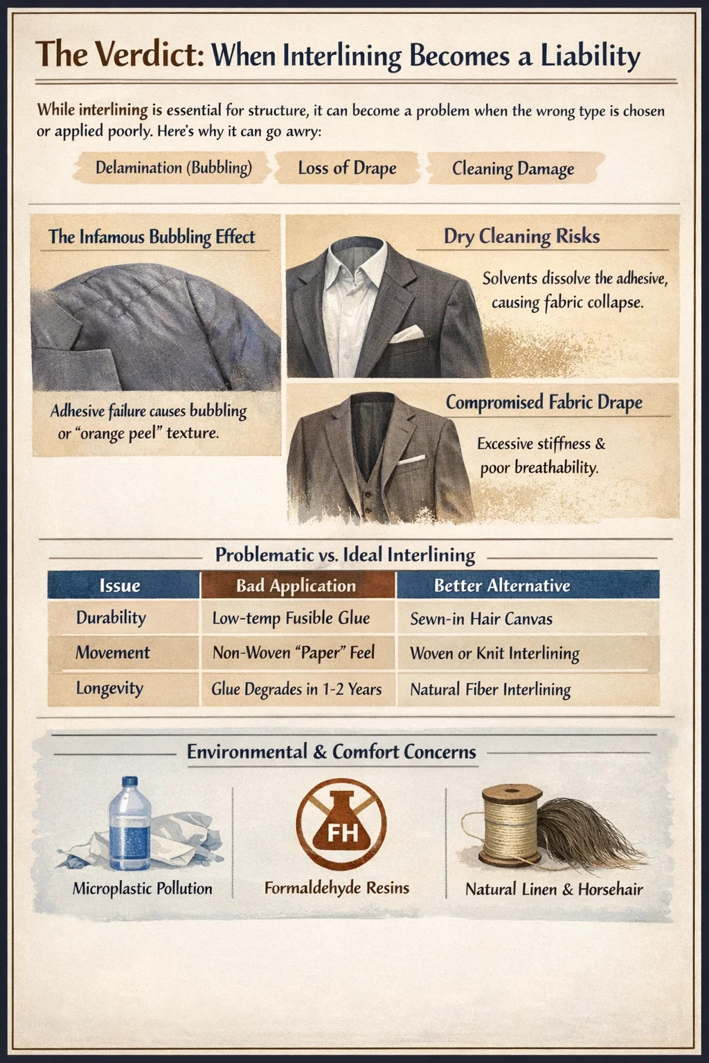 เพื่อให้ชัดเจน ซับใน ไม่ได้เลวร้ายโดยเนื้อแท้ ; อันที่จริงมันจำเป็นสำหรับโครงสร้าง อย่างไรก็ตาม มันจะกลายเป็น "ไม่ดี" เมื่อเลือกประเภทผิดหรือเมื่อใช้ไม่ดี สาเหตุหลักที่การบุผ้าด้านในอาจถือว่าเป็นอันตรายต่อเสื้อผ้าได้แก่ การแยกตัว (ฟอง) , ก การสูญเสียผ้าม่านตามธรรมชาติ , กnd อาการไม่พึงประสงค์จากการทำความสะอาด . เมื่อการยึดติดระหว่างผ้าประสานและผ้าหน้าล้มเหลว จะทำให้เกิดความเสียหายด้านสุนทรียะอย่างถาวรซึ่งไม่สามารถย้อนกลับได้